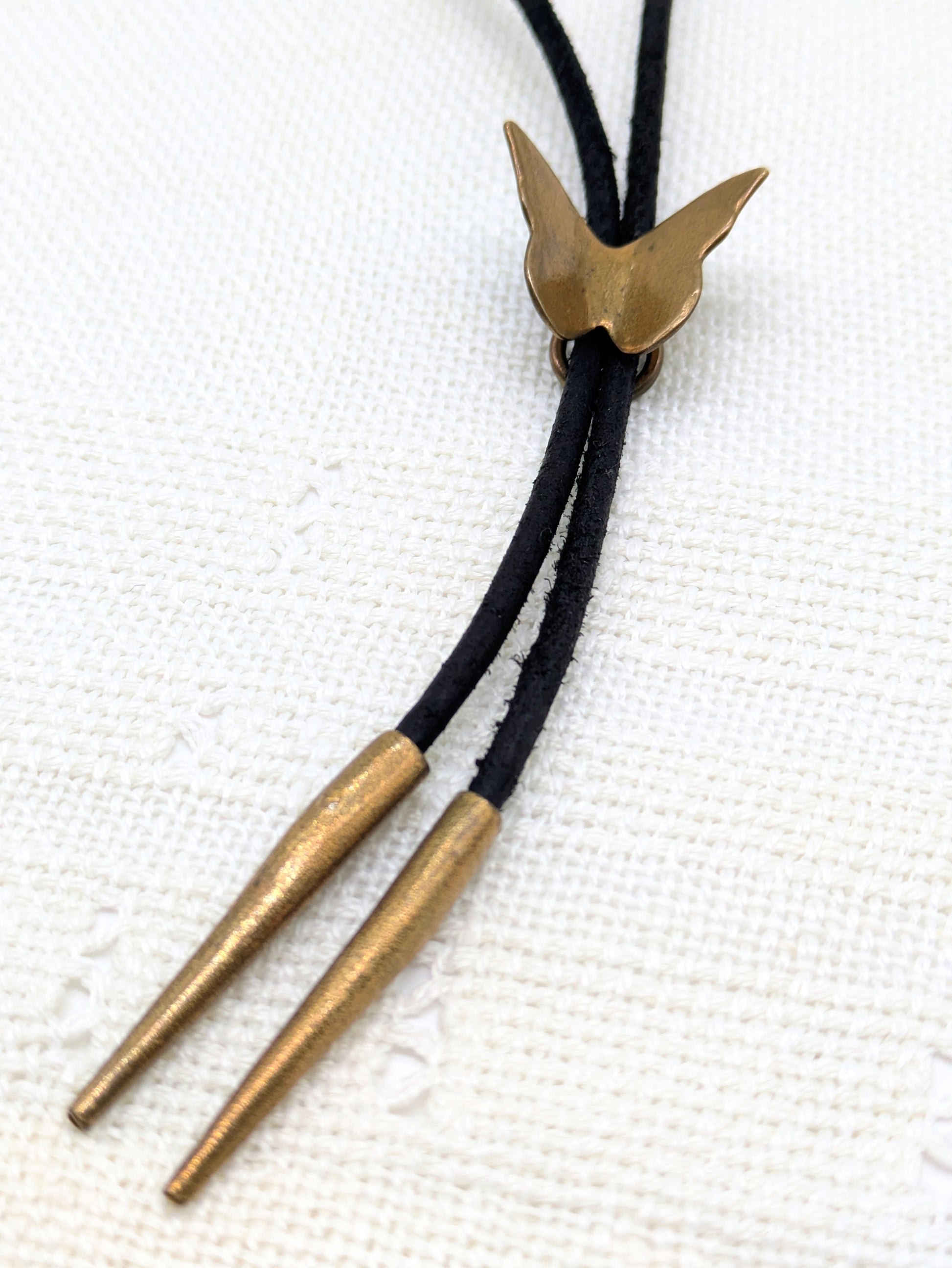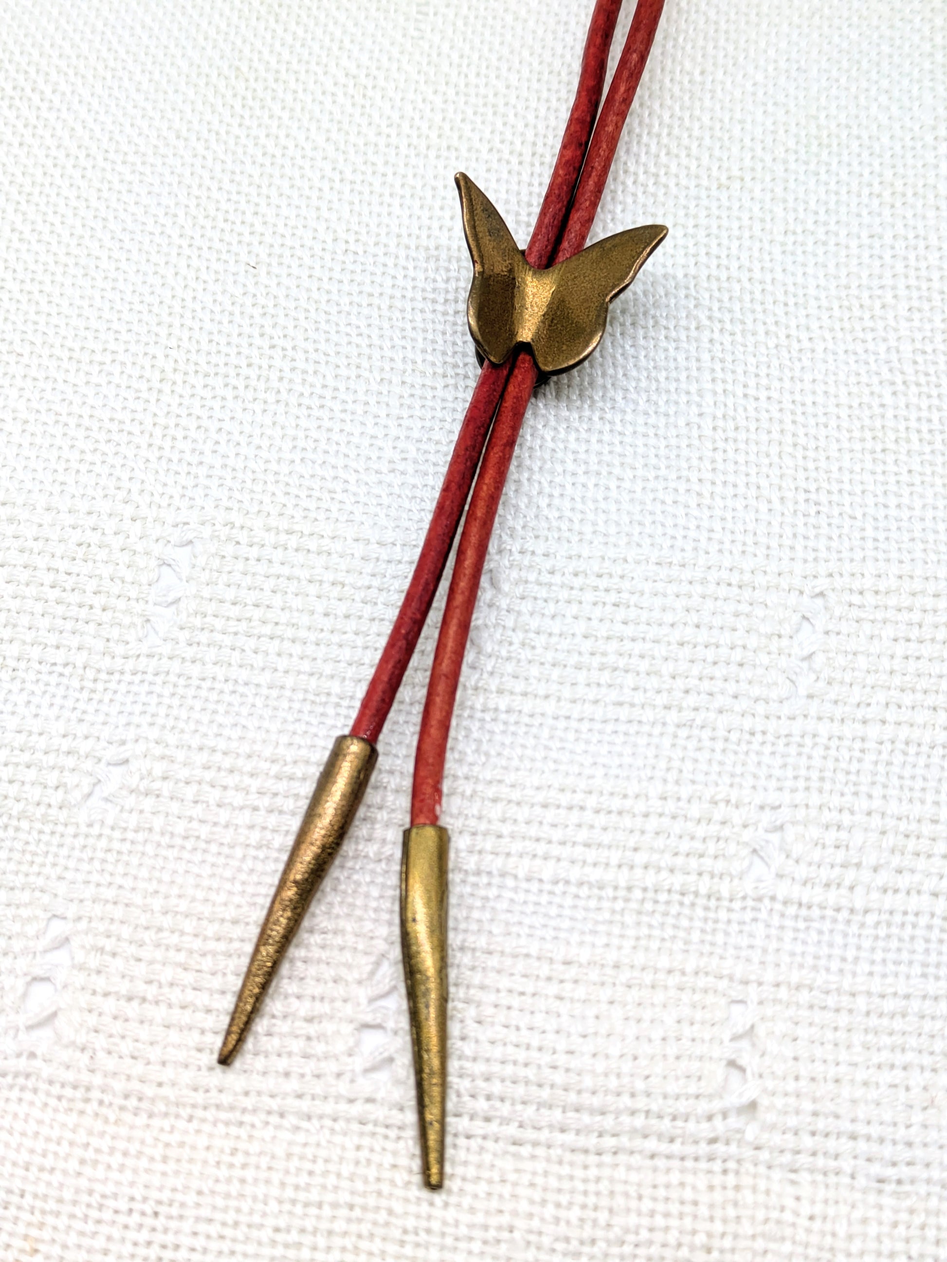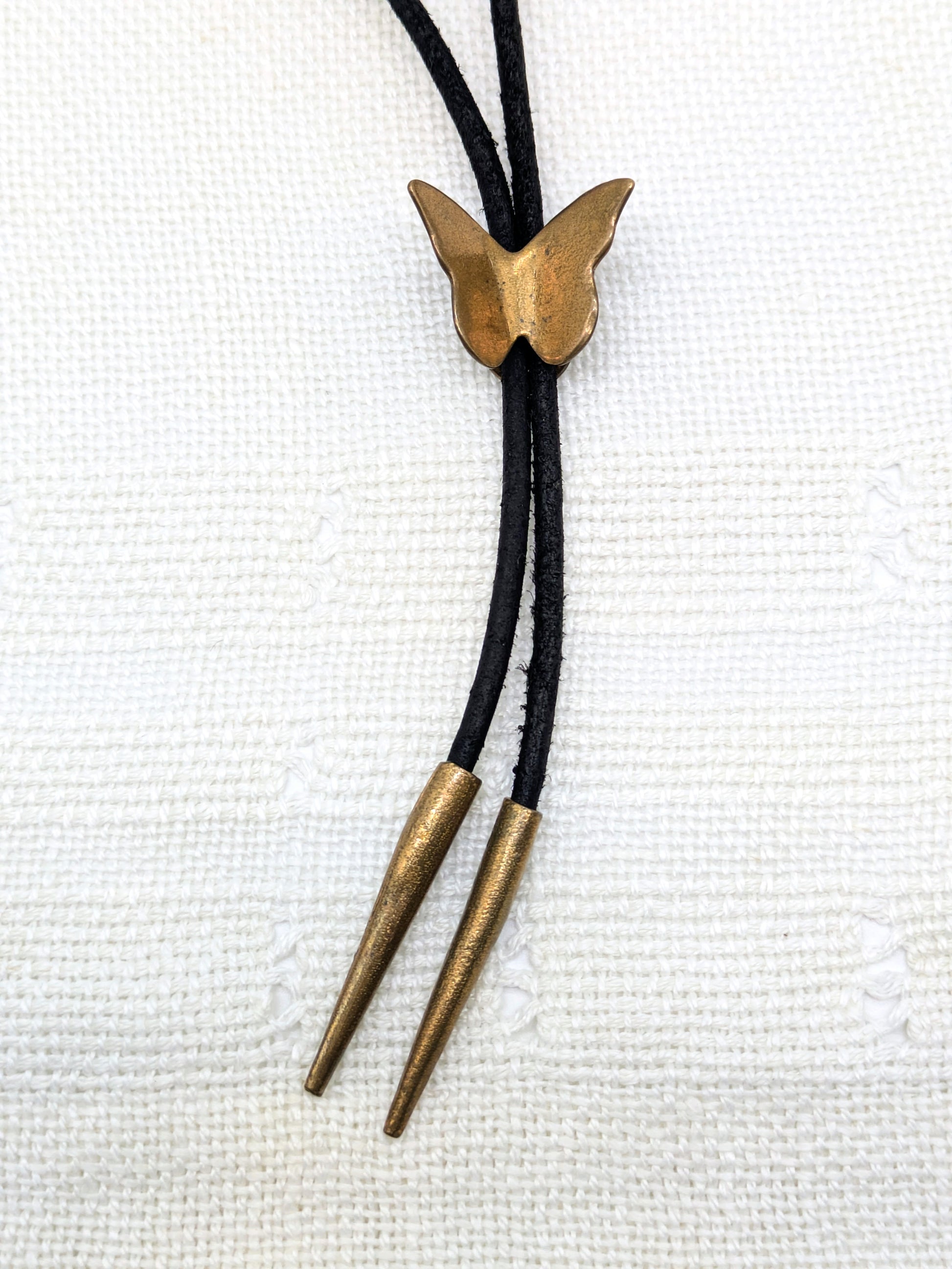 Hammered sliding brass butterfly bolo tie with handmade brass tips.