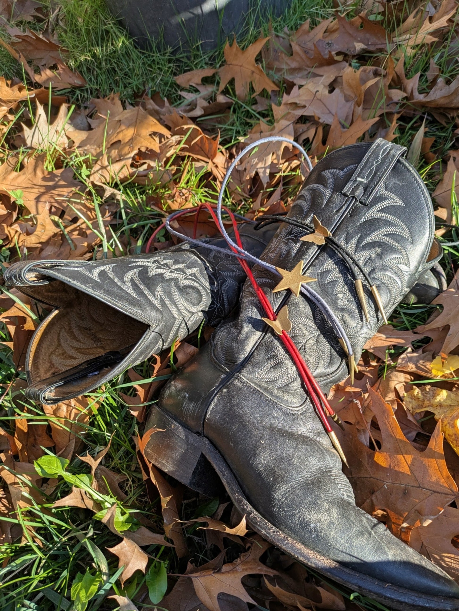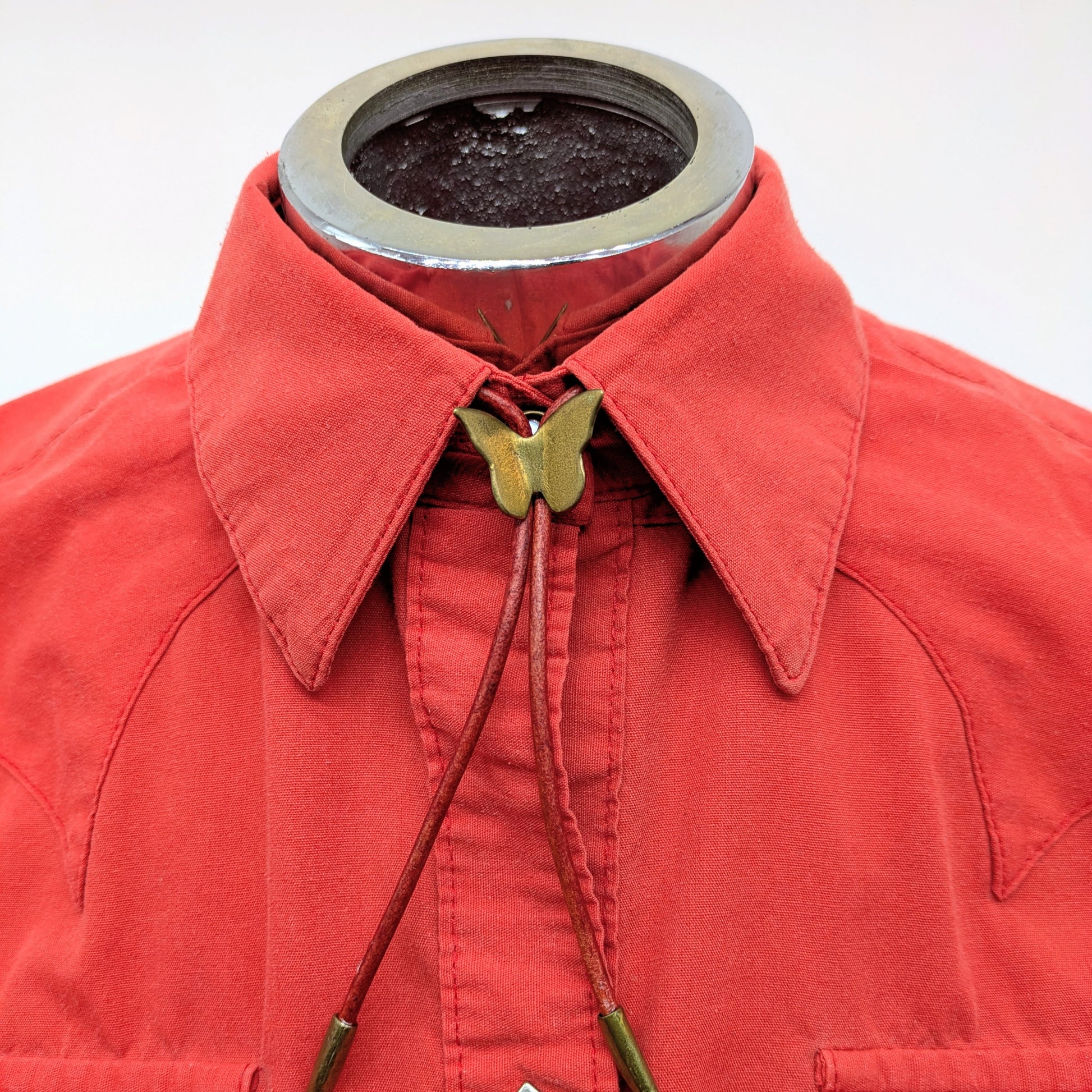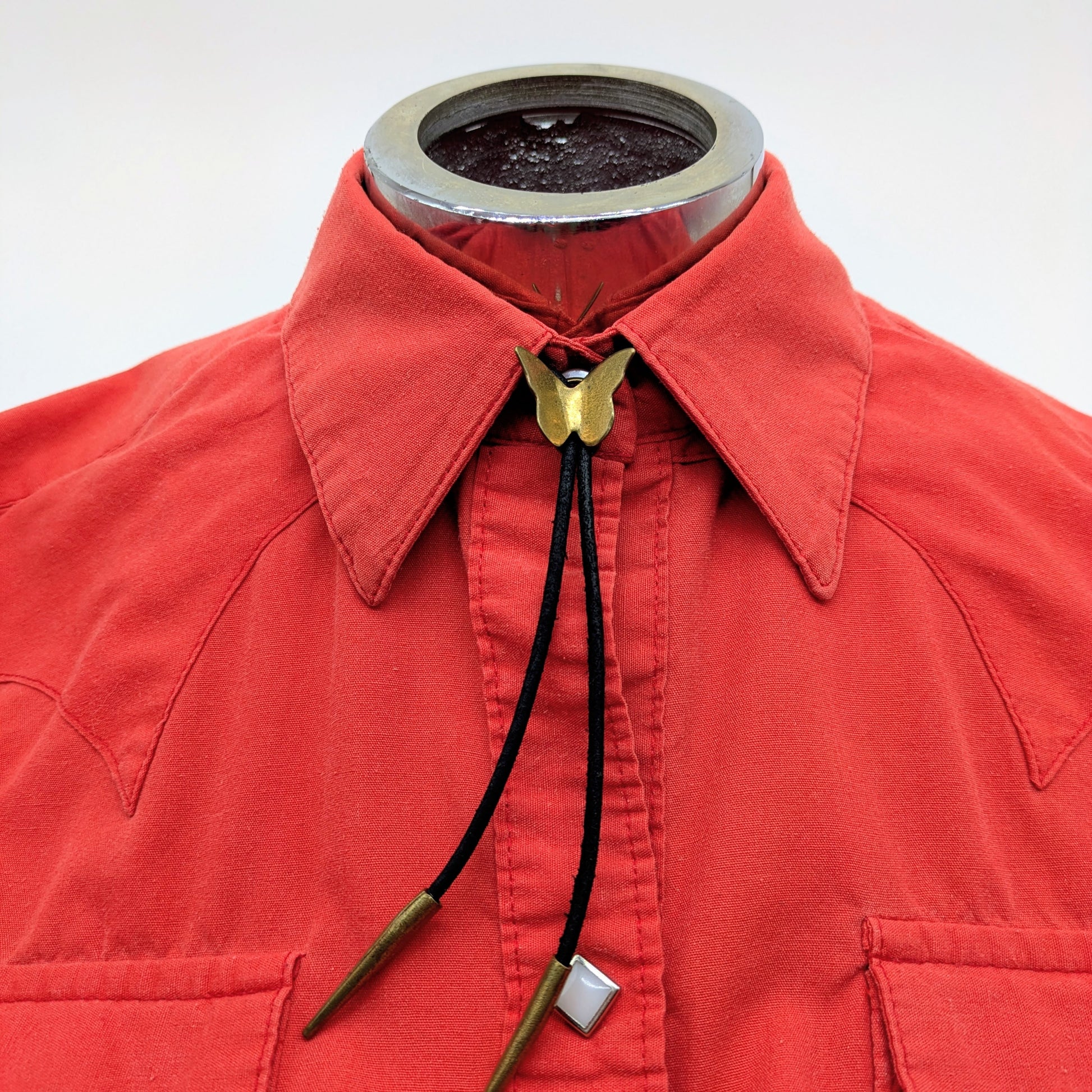 Hammered sliding brass butterfly bolo tie with handmade brass tips.