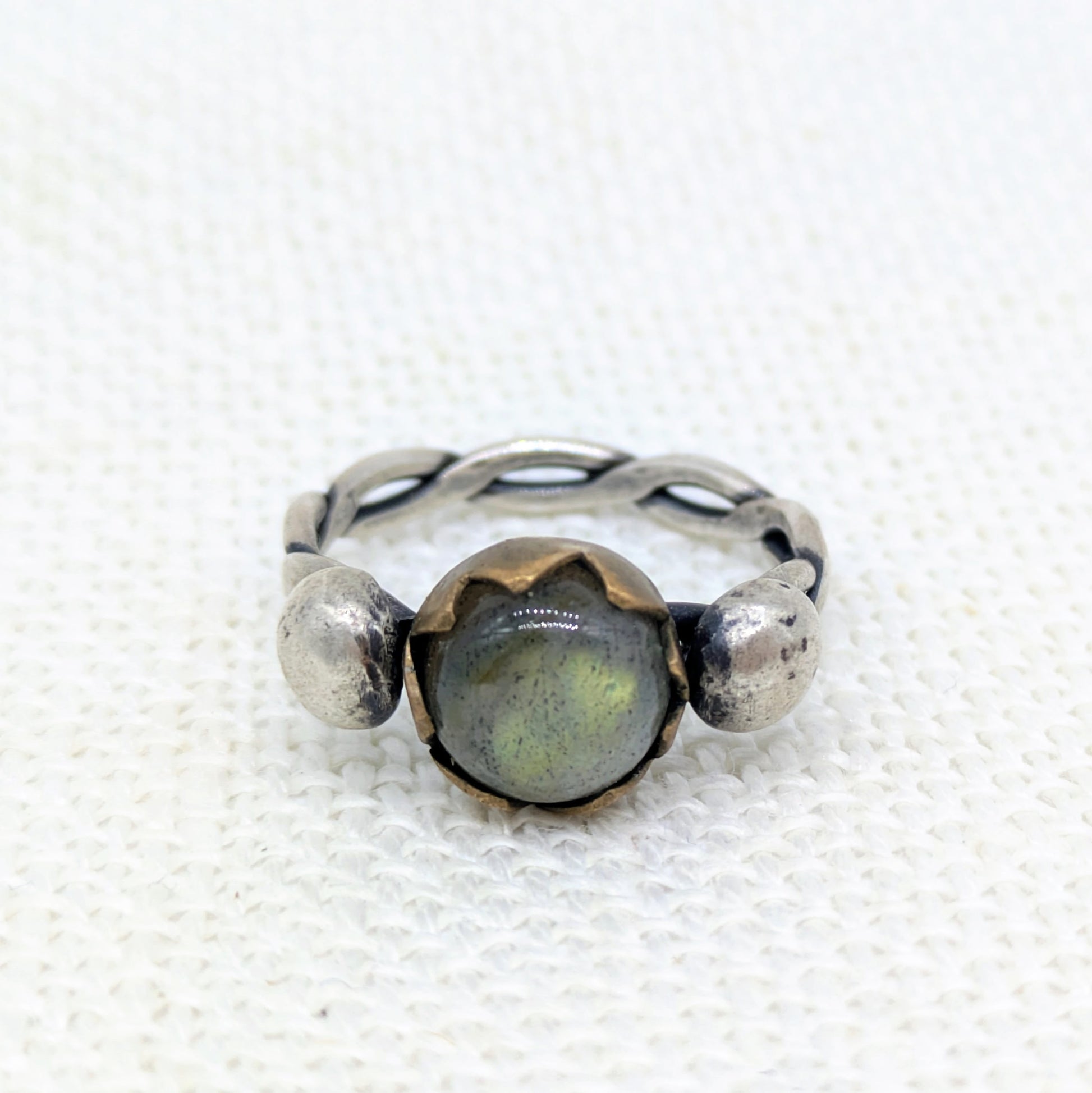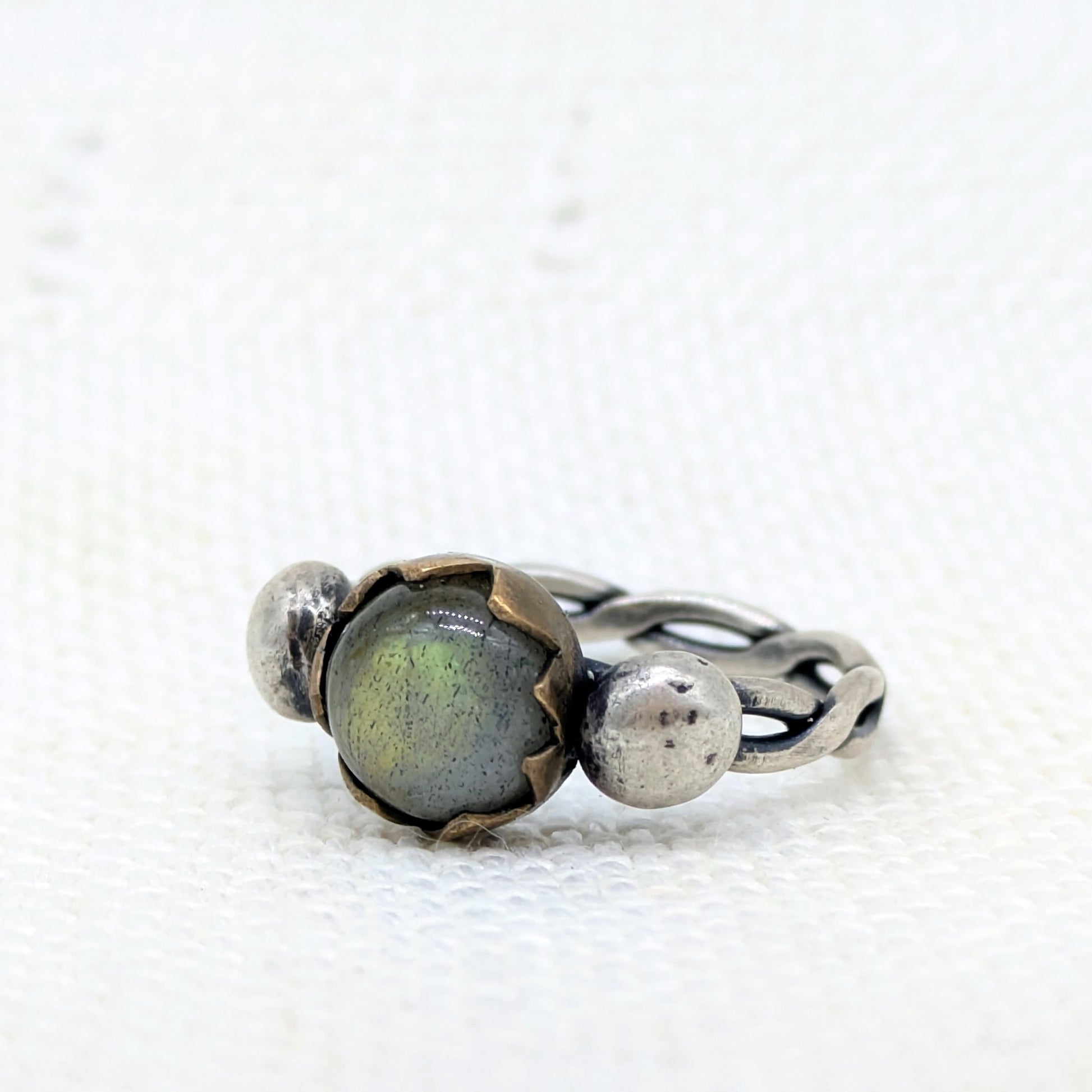 Pretty labradorite stone with brass bezel and sterling silver twisted band.